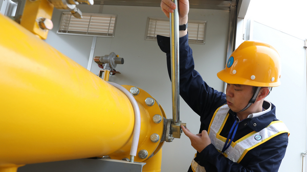 15日上午,在京东方项目现场,8名天然气工作人员在燃气调压箱中安装流量计。据介绍,该流量计小时流量达到5000立方米,是该司近十年来安装的最大流量计,相当于15户三口之家一年用气量。项目年用气量800万立方米,是东西湖区用气规模最大的企业,包括工业用气、食堂用气和员工宿舍多种类型,当天点火通气的是工业生产区,食堂和员工宿舍已于今年3月底通气。